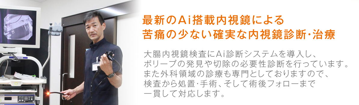 Ai大腸内視鏡検査(EndoBRAIN®)やAi超音波診断装置ARIETTA650 (DeepInsight®)などの最新のAi医療機器を用いて、迅速かつ正確に検査を行い速やかに結果をお知らせできる診療体制をとっています。 -